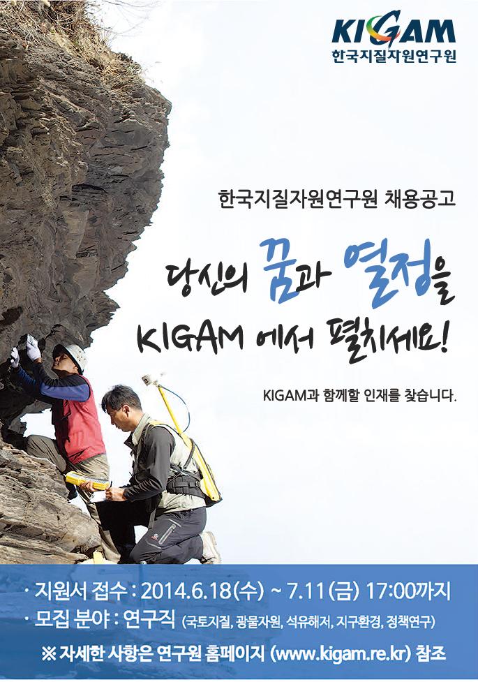 1) 응시원서 및 증빙서류는 접수마감일(7월11일) 17:00까지 방문 또는 우편접수분까지만 유효 - 단, 해외거주자는 연구원 E-mail(job kigam.re.kr)로 접수 가능하고, 접수된 서류는 일체 반환하지 않으며, 제출된 서류에 허위사실 발견 시 합격 취소함 * 제 증빙서류 우편발송 시에는 반드시 등기우편으로 발송하여 접수마감일(7월11일) 17:00 까지 연구원에 도착하여야 함 2) 2차 전형 응시자 중 해외 거주하는 연구직 지원자에 한하여 항공탑승권(Boarding Pass) 및 송장(Invoice) 제출 시 항공료 일부지원(Economy석 기준) 3) 응시원서에 개별통지가 가능한 연락처(전화번호와 e-mail) 반드시 기재바람 4) 영어이외에 외국어로 된 관련서류는 본인이 날인한 국문 번역문을 첨부바람 5) 최종합격자에 대한 초임계약은 2년으로 체결하고, 인사위원회의 재임용 심사평가에 따라 재임용 계약 체결 6) 기타 문의사항은 인력경영실 채용담당자에게 문의바람 - Tel : 042-868-3782, E-mail: job kigam.re.kr | |