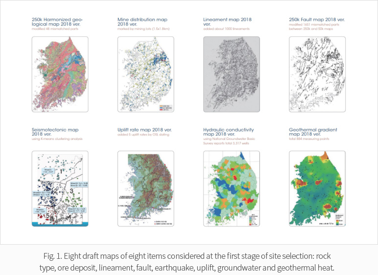In developing the GIVES, we grouped the geological aspects relevant to the first stage of site selection into the eight items of rock types, ore deposits, lineaments, faults, earthquakes, uplift, groundwater, and geothermal heat. We have developed a draft map for each of the eight items