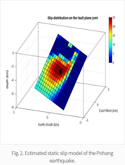 The Pohang earthquake provides a unique opportunity to constrain the static slip model of an earthquake in Korea using spaceborne InSAR observations, as surface displacement fields were successfully obtained by both descending and ascending orbits of the Sentinel-1A/B satellites. By collaborating with the Remote Sensing and GIS Lab at Kangwon National University, we undertook linear slip inversion to obtain a finite source model for this event using InSAR data. Our slip model reveals that a major slip associated with the event occurred in the northeastern part of the hypocenter, rather than in the southwestern part. In addition, its rupture dimension and mean slip are 5 km (width) by 6 km (length) and 15 cm, respectively. The InSAR data also show that no significant post-seismic deformation occurred after the event.