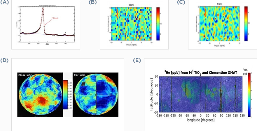 Fig. 1. A global lunar oxygen map (a) Gamma-ray peak of oxygen 6,129 keV on the moon (b) Ten-degree global oxygen elemental map (count/minute) (c) Five-degree global oxygen elemental map (count/minute) (d) 3D ten-degree oxygen map of the moon (e) A He-3 elemental map was produced using the TiO2 data from Chandrayaan-1 M3 data and OMAT (optical maturity) from the Clementine data.